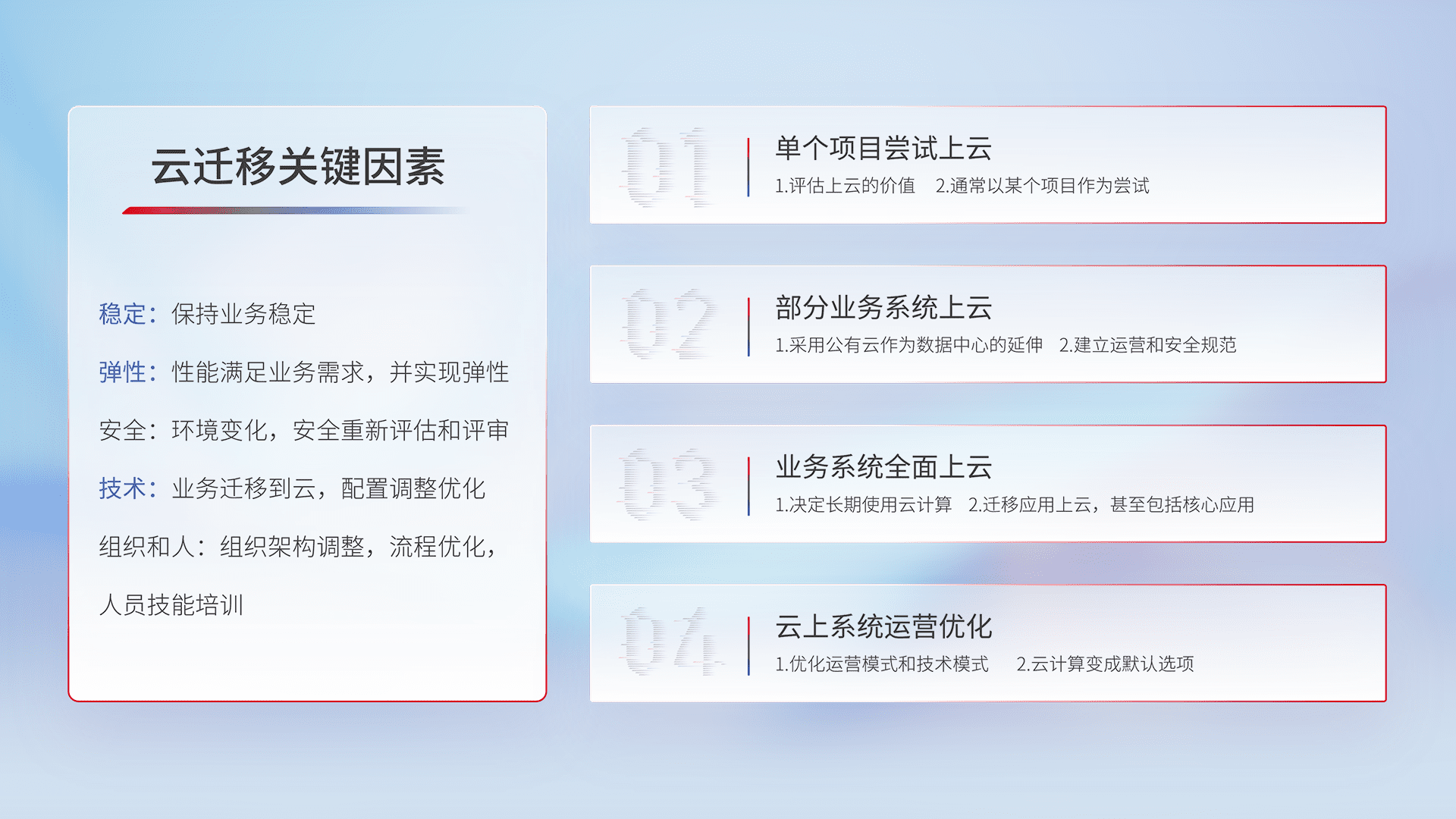 结合实际业务,,从规划设计、、云平台选型、、、云原生改造、、、、数据迁移、、、集成交付,,,迁移全过程为客户识别最佳上云路径,,做好风险识别管理,,,设计网络架构、、、身份权限、、、安全审计合规、、操作审计、、、日志审计、、监控告警策略、、、、多站点容灾设计等,,,对云上基础设施进行整体规划,,提升IT治理水平,,以满足弹性、、、高可用、、、高性能的需求。。。