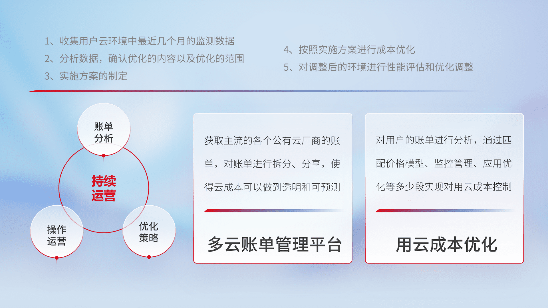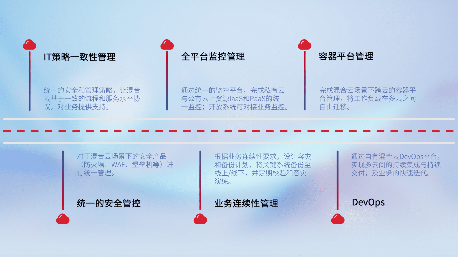 通过多云纳管,,以统一的资源数据模型把客户的云资源进行抽象和封装,,进而实现对多云资源的统一操作,,,保障云资源管理的可靠性、、、稳定性与可用性。。。。量身定制化运维内容,,,配置、、、、开发运维、、、补丁管理、、、备份、、、监控、、、、认证和访问管理、、、审计和日常巡检等,,,,保障在用云过程中的可靠度,,稳定度以及高可用率。。。。